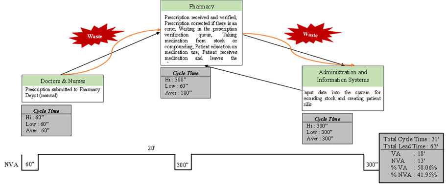 Based on Figure 1 presented, the pharmaceutical service process at Viola Hospital still faces inefficiencies that cause waste. The process begins when doctors and nurses manually submit prescriptions to the pharmacy depot, with an average Cycle Time of 60 s. Furthermore, the pharmacist verifies the prescription, corrects any errors, validates the queue, dispenses the medicine, educates the patient, and ensures the medicine is delivered, with an average Cycle Time of 180 s. After that, the administration and information system input the prescription data into the system for recording stock and making patient bills with an average Cycle Time of 300 s. The diagram also highlights the waste of time at the pharmacy and administration stages, which causes non-value-added time (NVA) to account for 41.95% of the total process time, equivalent to approximately 13 min of the total Lead Time of 63 min.