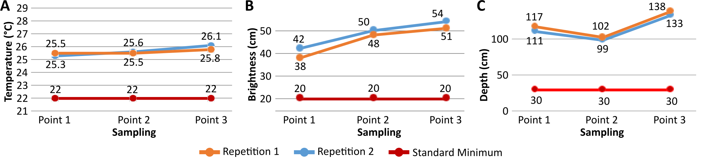 Water sampling was carried out at three predetermined locations between 09:00 and 10:00 AM. Field measurements included water temperature, recorded using a thermometer submerged until stable readings were obtained; transparency, measured with a Secchi disk lowered until it disappeared from view; and depth, determined using a weighted measuring rope. pH was measured by immersing a pH meter electrode until a stable reading was displayed, while dissolved oxygen (DO) levels were measured using a DO meter with direct digital readout after immersion in the water.