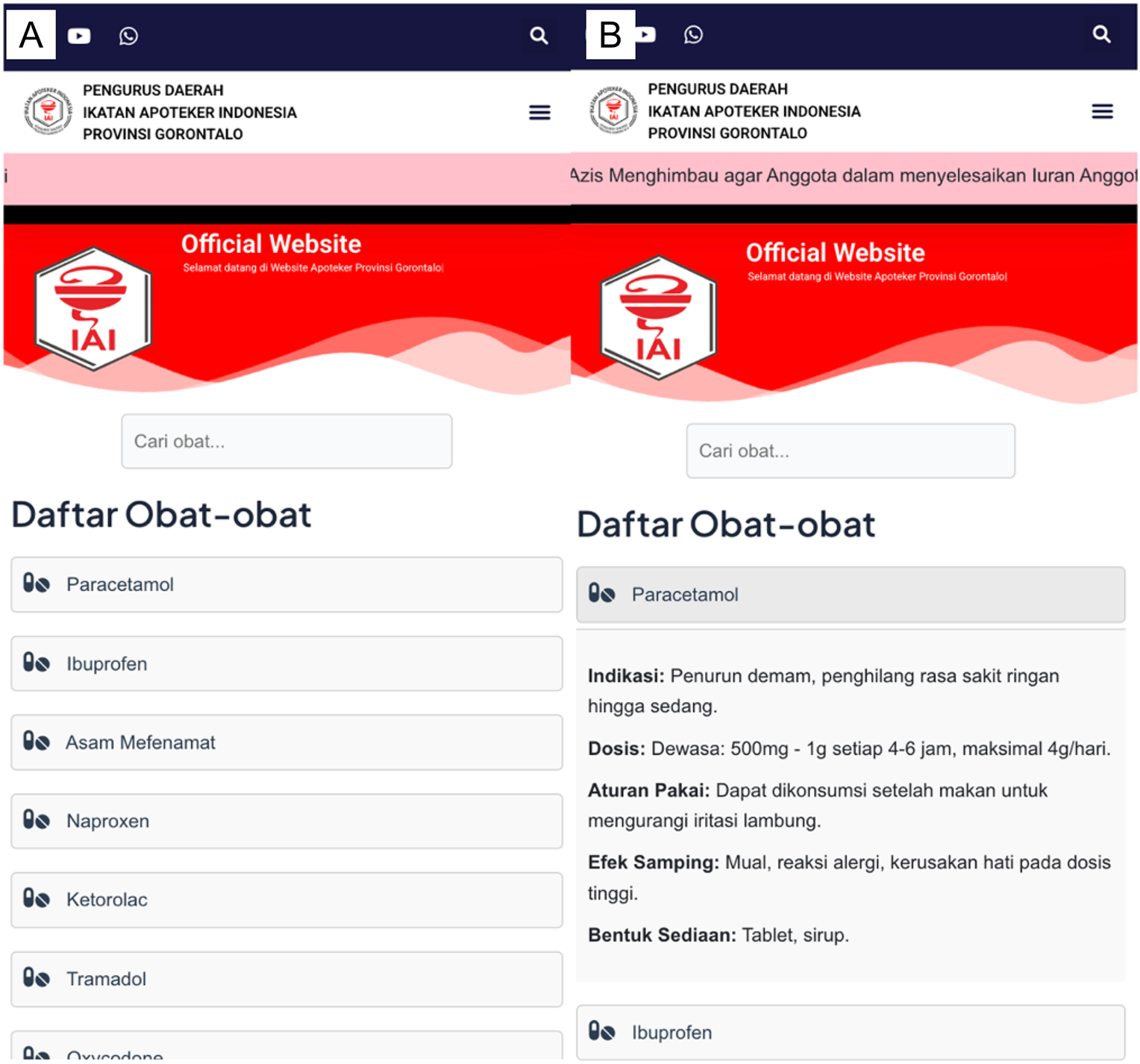 This study was conducted using the official website of the Ikatan Apoteker Indonesia (IAI) Gorontalo Province, based on the WordPress platform. The study specifically focused on the "Cari Obatmu" feature of the website, which was designed to provide an efficient and user-friendly tool for searching drug-related information. As members of the Indonesian Pharmacists Association (Ikatan Apoteker Indonesia), we frequently hold meetings in the form of workshops discussing the development of medications in Gorontalo. Additionally, as academics from the State University of Gorontalo, we regularly research the profile of drug use in the Gorontalo Province. Through these activities, we have gained a thorough understanding of the availability and usage of medications in Gorontalo. The page offers comprehensive details about commonly used drugs in Gorontalo, including drug indications, dosages, administration instructions, side effects, and available pharmaceutical forms in the market. The drug data used for the application was sourced from credible journals and reliable articles to ensure the accuracy and trustworthiness of the information presented. Indonesian is the main language available in this application. The website’s drug information page can be accessed via the following link: IAI Gorontalo Website.