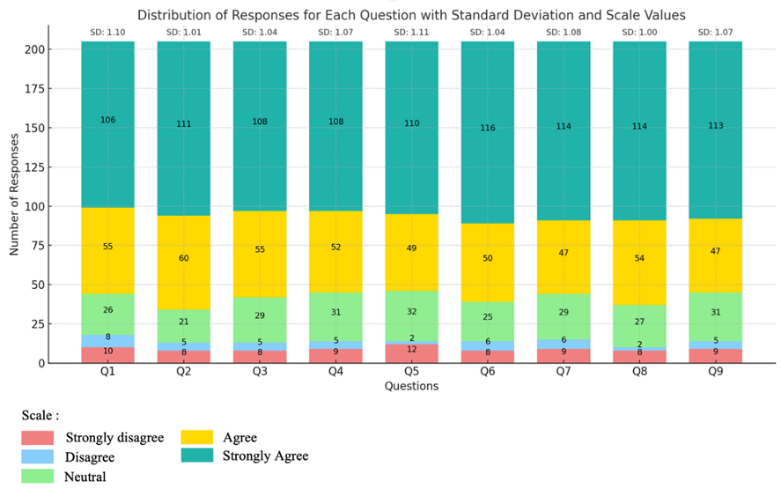 Table 2 displays the frequency statistics for the 205 survey responses, offering an overview of the participants' evaluations of the web-based drug information application. The mean values for all nine questions range from 4.16 to 4.28, indicating general agreement with the statements presented in the survey. These values suggest that users are largely satisfied with the application’s usability, ease of understanding, and the relevance of the drug information it provides. The median and mode values for each question are consistently 5.0, signifying a strong tendency toward the highest level of agreement, Strongly Agree (Scale 5), across all survey items. This uniformity in responses underscores the overall positive reception of the app, with respondents indicating that they found the app easy to understand and operate, and that the drug information it provides is helpful (45, 46).