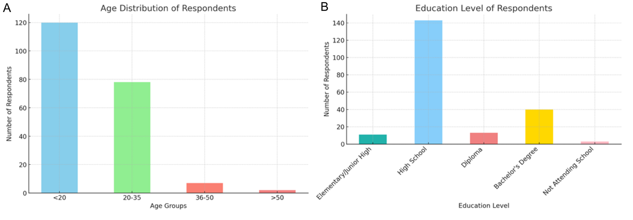 The demographic profile of the 205 respondents who participated in the survey reveals that a significant portion of participants were under 20 years old (58.5%). This suggests that the web-based drug information application is more frequently accessed by younger individuals, likely due to their greater familiarity with technology and mobile devices. Additionally, 38% of respondents were between 20-35 years of age, indicating that young adults comprise a large segment of the user base (see Figure 3A). This age group is often more proactive in seeking health-related information through digital platforms, which aligns with trends in healthcare technology adoption among younger populations (27-30).