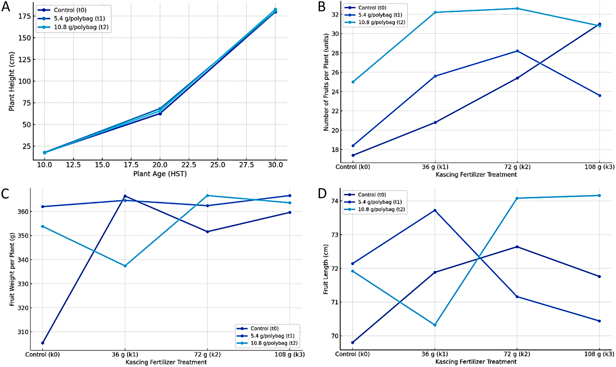 In summary, the findings highlight that TSP fertilizer is effective in increasing fruit weight per plant at a dose of 10.8 g/polybag, although it did not significantly affect other growth or yield parameters. Kascing fertilizer showed the highest yield at 72 g/polybag, but similarly did not significantly influence other growth or yield aspects. The interaction between TSP and Kascing fertilizers had no significant effect on any of the observed parameters.