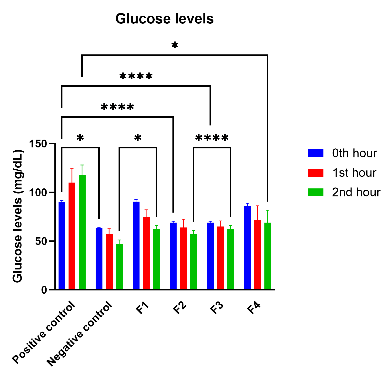 As presented in Figure 2, the positive control (glucose) was measured as 89 mg/dL at the 0th hour (GDP). Subsequently, at the 1st h, glucose levels elevated to 113.2 mg/dL, and 118.6 mg/dL was recorded at the 2nd h. In the negative control group, specifically using Na CMC, the glucose level was measured at the 0th hour as 61.5 mg/dL. Then, at the 1st hour, the value decreased to 55.6 mg/dL, and a further decline to 50.6 mg/dL was observed at the 2nd hour. The use of Na CMC as the negative control group was intended as a suspending agent to facilitate oral administration of the flakes. Na CMC at 0.1% is widely reported to be inert and does not influence glucose metabolism, thus serving as an appropriate vehicle control (38). In the case of F1 sample (C. esculenta L.) exposed to a temperature of 40 °C, the initial glucose level at the 0th h was measured to be 89.8 mg/dL. Subsequently, it reduced to 72.6 mg/dL in the 1st h, and 65.8 mg/dL was recorded in the 2nd h. In F2 dried under 60 °C, the glucose level was 68.8 mg/dL at the 0th h, then a drop to 64 mg/dL occurred in the 1st h, and 58.4 mg/dL was measured in the second hour. In F3 subjected to 80 °C, the glucose level was measured at the 0th hour as 69 mg/dL, which decreased to 64.8 mg/dL at the 1st h, and finally to 60 mg/dL at the 2nd h. The results indicated that glucose response decreased consistently across all taro flake samples subjected to different drying temperatures. In the analysis of F4 (wheat flour), the glucose level was measured at the 0th h as 85.8 mg/dL, decreasing to 73 mg/dL at the 1st h, and then to 68.4 mg/dL at the 2nd h. Moreover, the AUC calculation for glucose, F1, F2, F3, and F4 generated the following results 105.35; 38.75; 15.95; 17.63; and 8.45, respectively.