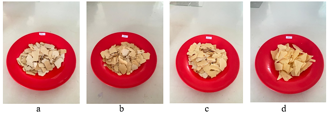 Based on the results of the hedonic responses, the taro tubers-based flakes obtained had acceptable physical properties. The appearance of taro tubers-based flakes can be seen in Figure 1. Hedonic evaluation involved untrained panellists who represented potential consumers then they rated the level of liking or subjective preference for taro tubers-based flakes products. The assessment included taste, colour, texture and aroma.