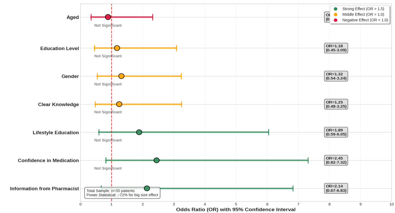 There are some problems with this study that need to be pointed out. First, while adherence and knowledge exhibited substantial effect sizes, knowledge and education failed to reach statistical significance. The study was likely underpowered to detect significant differences in demographic variables, as indicated by the contrast between substantial effect sizes and non-significant p-values. Even though the odds ratios were clinically significant, the forest plot didn't show any factors that were statistically significant because the sample size was too small (n = 35). To confirm these patterns, larger sample sizes are necessary in subsequent research. Second, causal relationships cannot be inferred due to the study's cross-sectional observational design lacking a control group. The identified correlations do not reflect intervention effects; instead, they represent baseline correlations. Third, the single-center design of one community health center limits generalizability to various Indonesian contexts.