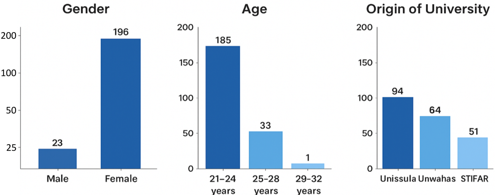 A total of 219 pharmacy professional students participated in this study. The majority of respondents are female (77.6%) and aged 22-24 years (88.1%), as shown in Figure 1. Respondents were distributed almost evenly across the four universities surveyed. Female respondents dominated the completion of the research questionnaire. This is consistent with research conducted, which shows that graduates of pharmacy bachelor's degrees and the pharmacy profession are predominantly female. This is because the Pharmacy major is more popular with women than men. This result is also in line with the research (12–14), which shows that national data indicates women are expected to represent approximately 86% of pharmacists in Indonesia by 2030, and global analysis shows that from 2006 to 2023, the representation of women in the pharmaceutical workforce has increased significantly, with projections that by 2030 more than 70% of the world's pharmacists will be female (15). Respondents aged 20-25 years had the highest percentage in that study. That age is adulthood or young adulthood, where individuals have responsibility for their actions, attitudes, and desires and are not dependent on others (16).