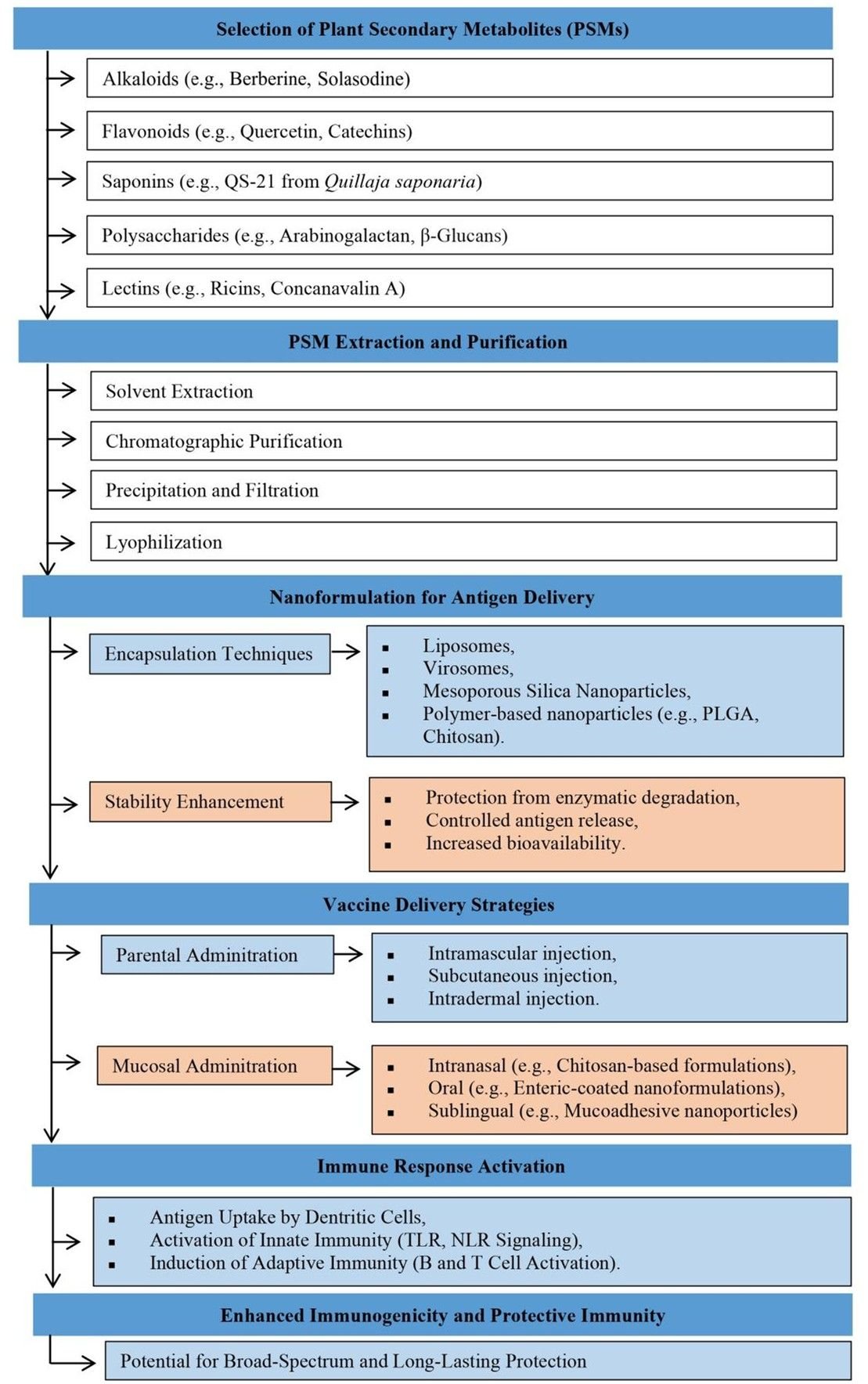 The potential for needle-free vaccination with plant-derived adjuvants is gaining attention, especially in mucosal immunization; oral and Intranasal vaccines protect pathogen entry sites and may enhance systemic and mucosal immunity. Current vaccine formulations include polysaccharides, saponins, lectins, and PSMs that enhance mucosal immune responses (61). Enhanced IgA and IgG responses result from increased antigen absorption by mucosal-associated lymphoid tissues using liposomal and virosomal delivery systems (62). Chitosan-based nanoparticles, recognized for their mucoadhesive properties, enhance antigen retention and immune activation in oral and nasal vaccines (63). Using flagellin, a Toll-like receptor 5 agonist, enhances the immunogenicity of Intranasal vaccines by augmenting dendritic cell activation and cytokine production as a mucosal adjuvant (64). Despite these advancements, challenges such as mucosal tolerance and enzymatic degradation in the gastrointestinal tract must be addressed to optimize plant-based adjuvants for oral and Intranasal vaccine delivery. Figure 2 presents a flowchart depicting PSM-based vaccine formulation and delivery strategies, from selection of plant secondary metabolites such as alkaloids, flavonoids, saponins, polysaccharides, and lectins, to PSM extraction and purification to nanoformulation for antigen delivery, to vaccine delivery strategies such as parental and mucosal administration to immune response activation, and finally to enhanced immunogenicity and protective immunity.