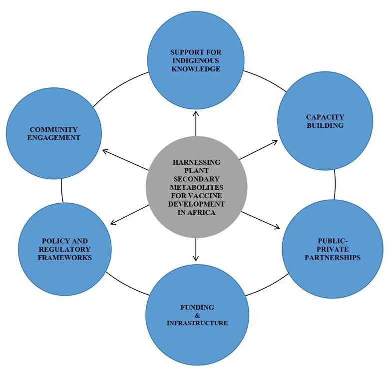 To ensure sustainability and stimulate innovation, public-private partnerships (PPPs) are essential (97). Strategic partnerships among academic institutions, research centers, pharmaceutical companies, and traditional medicine practitioners can improve knowledge sharing, technology transfer, and market integration (98). Educational institutions provide training and research proficiency, but industry involvement presents production scale and regulatory navigation opportunities. Collaborations with traditional practitioners at the community level foster trust and facilitate culturally sensitive implementation. PPPs can establish a sustainable framework for vaccine development in Africa by aligning public health priorities with indigenous knowledge systems and private sector innovation. By fortifying health systems and promoting scientific autonomy, these policy measures and capacity-building endeavors will enable African nations to use their biodiversity to develop innovative vaccines. A conceptual framework is shown in Figure 3 to allow the harnessing of PSMs for vaccine development in Africa; capacity building, community engagement, public-private partnerships, and improvement of policy and regulatory frameworks should be included.