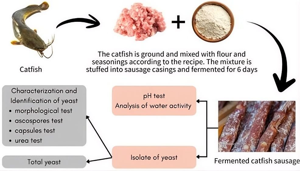 The conclusions of this study indicate that the yeast isolated from fermented catfish sausage belongs to the genus Candida sp., which exhibits diverse morphological characteristics, including round, oval, cylindrical, and elongated shapes, and may present with or without pseudohyphae. Biochemical characterization showed that Candida sp. does not form ascospores, does not possess capsules, and does not produce urea. The presence and activity of yeast were found to influence the chemical and microbiological properties of the fermented product, as reflected in an average pH value of 4.23, water activity (Aw) of 0.62, and total yeast count of 2.6 × 10⁴ CFU/mL. Furthermore, the results demonstrate that lactic acid bacteria (LAB) are not the only microorganisms involved in the fermentation process, as yeast also plays a significant role in contributing to the overall quality of the product. Consequently, these findings highlight the complex microbial synergy required to develop the unique flavor profiles and structural integrity characteristic of traditional fermented sausages.