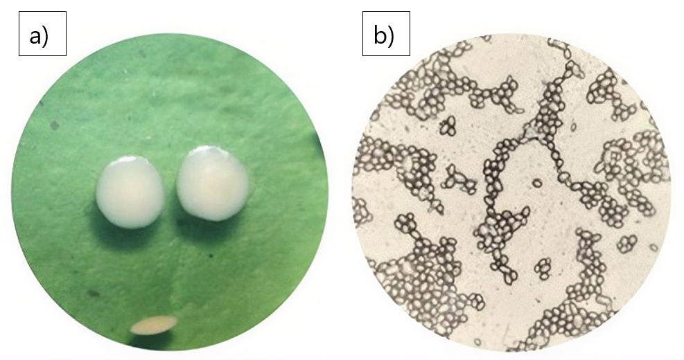 Based on Figure 2, macroscopic observations show that yeast colonies are milky white, evenly elevated, shiny with smooth and even edges. The same is reported by (21), that yeast isolates generally have a milky white color, and some yeast isolates have a creamy white, yellowish white, and brownish white color. Yeast isolates have a flat and raised elevation, all isolates have a shiny surface with smooth and flat edges. Microscopic observations show that yeast cells are round, oval, and without pseudohyphae. Based on the microscopic similarity of the isolate, it is suspected to belong to the Candida genus of yeast. This is supported by the opinion of (22), that yeast of the Candida genus have cell shapes that vary from round, oval, cylindrical to elongated, rarely apiculate, ogival, triangular or bottle-shaped with or without pseudohyphae. Asexual reproduction occurs through multilateral budding. However, to confirm that the isolated genus is indeed Candida, biochemical testing is required to ensure the yeast identification process is more accurate and clear.