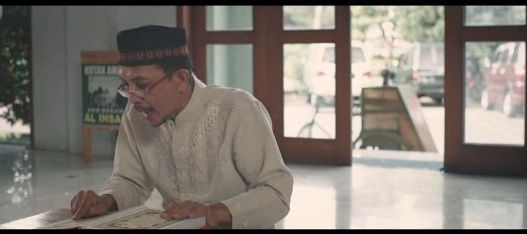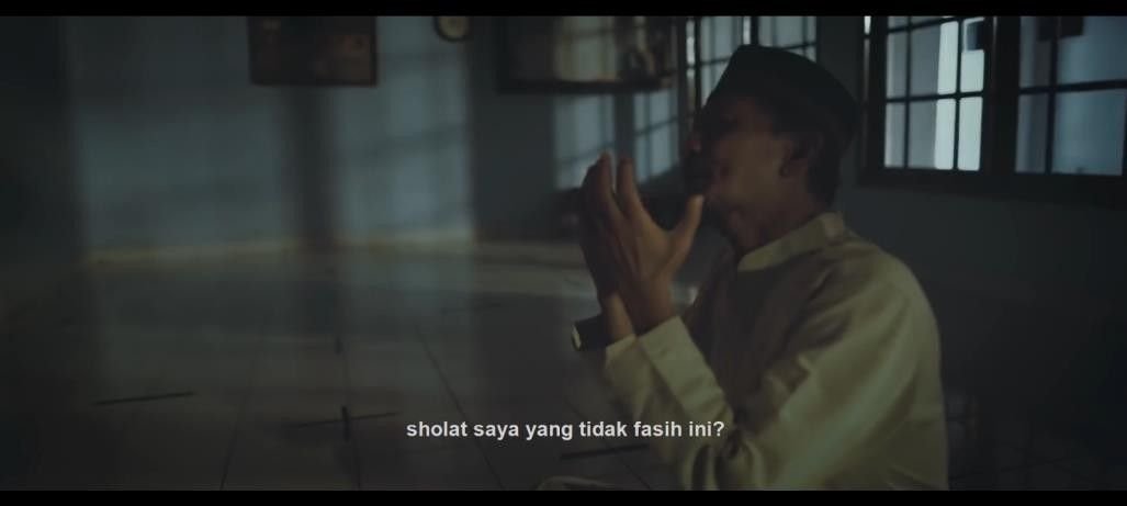 The visual construction of ikhtiar is further reinforced by the character’s dialogue expressing determination during the learning process. In one scene, Suto verbally acknowledges the difficulty of mastering the recitation while continuing his practice. This combination of verbal expression and close-up visual framing strengthens the narrative coherence between dialogue and cinematographic technique, allowing the audience to interpret perseverance not merely as a narrative theme but as an embodied spiritual practice represented through audiovisual language.
