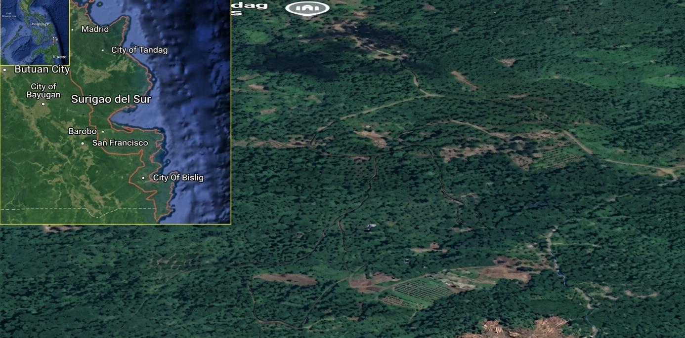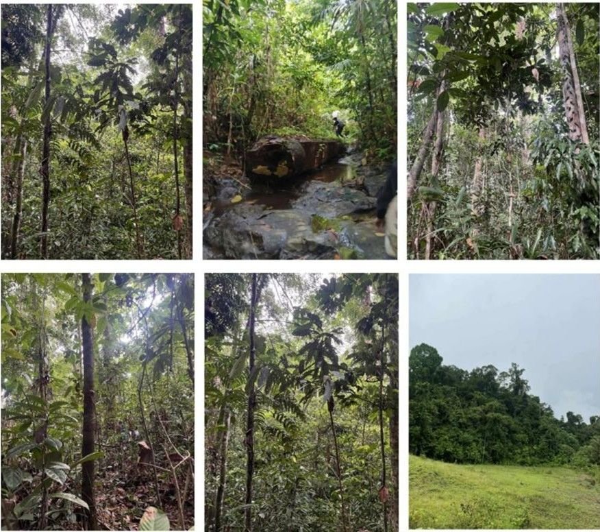 Field surveys were conducted in Sitio Inadan, Barangay Magroyong, San Miguel, Surigao del Sur, Mindanao, Philippines, as illustrated in Figure 1 while the actual condition of the sampling site is presented in Figure 2. The area is characterized by secondary forest vegetation interspersed with shrubs, flowering plants, and small-scale agroforestry patches, forming a heterogeneous habitat mosaic. Sampling locations were established along existing forest trails and semi-open areas to capture variation in vegetation structure and resource availability. Geographic coordinates and elevation of each transect were recorded using a handheld Global Positioning System (GPS) unit to ensure spatial accuracy and facilitate reproducibility.