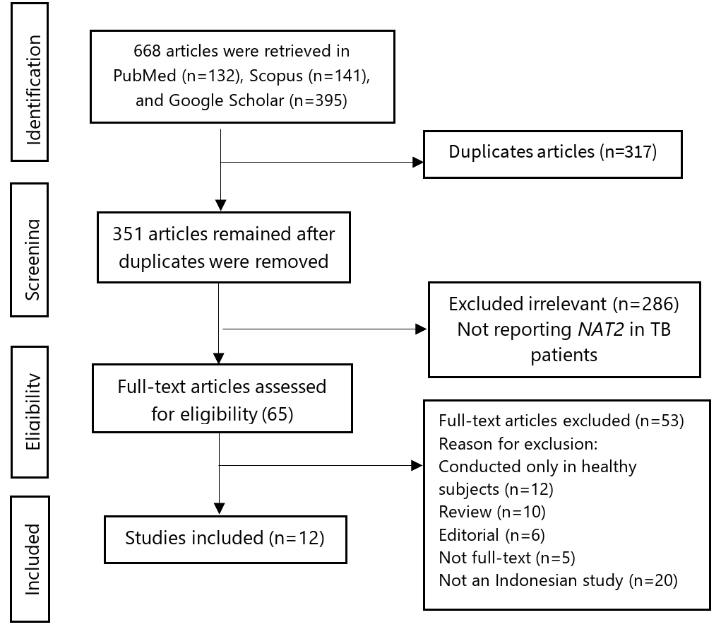 The inclusion criteria in this scoping review were: 1) articles written either in English or Indonesian; 2) articles as original articles with cross-sectional, cohort, or case-control studies, and pharmacokinetic studies; 3) reporting genetic polymorphism of NAT2 and or NAT2 phenotypic (acetylator status). Articles analyzing the association between the genetic polymorphism of NAT2 with drug-induced liver injury, pharmacokinetic profile, and treatment outcomes were also included. Studies that included patients receiving INH for conditions other than tuberculosis, such as other mycobacterial infections, were excluded. Reviews, letters to the editor, and commentaries were also excluded from this review.
